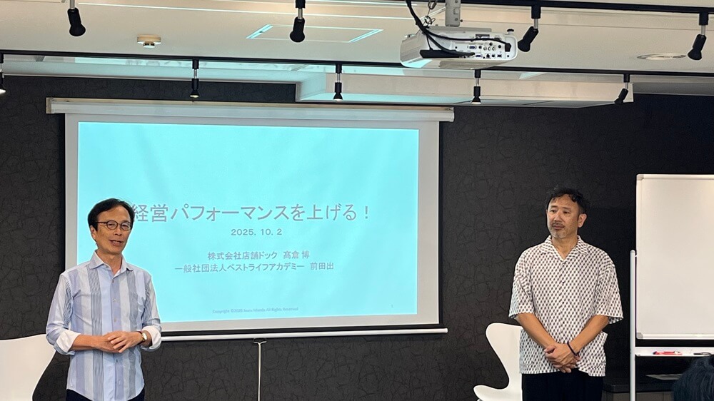 今回は、一般社団法人ベストライフアカデミー 代表理事 前田 出 氏と、株式会社店舗ドック 代表取締役 髙倉 博 氏を講師にお迎えし、「経営パフォーマンスを上げる!」をテーマにご講演いただきました。